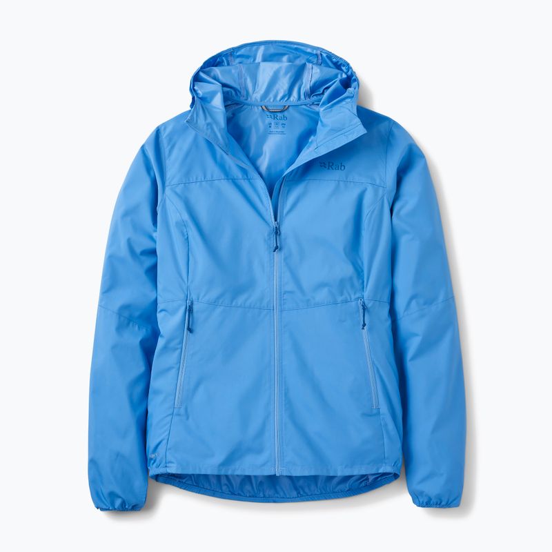 Jachetă de vânt pentru femei Rab Windgather Hoody protejează împotriva vântului în timpul activităților turistice, folosind materialul Pertex® Quantum și un strat DWR. În construcție s-a utilizat poliester complet reciclat și un fermoar YKK® pentru fiabilitate și ușurință.